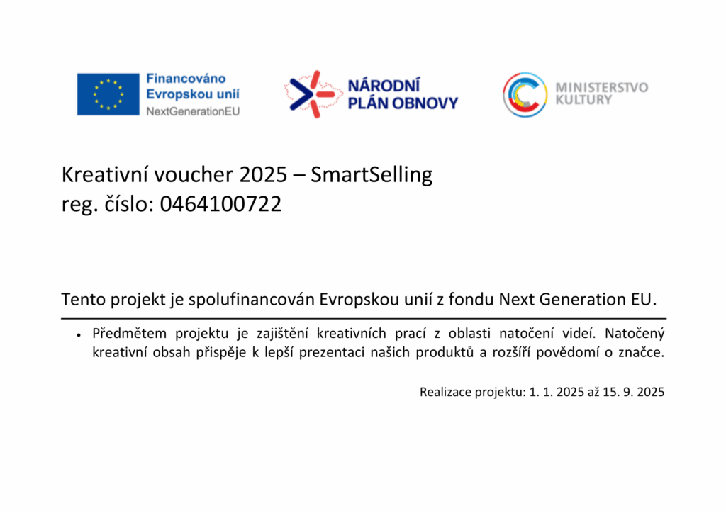 Projekt je spolufinancován z prostředků Evropské unie z fondu Next Generation EU (85%) a z prostředků společnosti SmartSelling a.s. (15%). V termínu od 1.1.2025 do 15.9.2025.